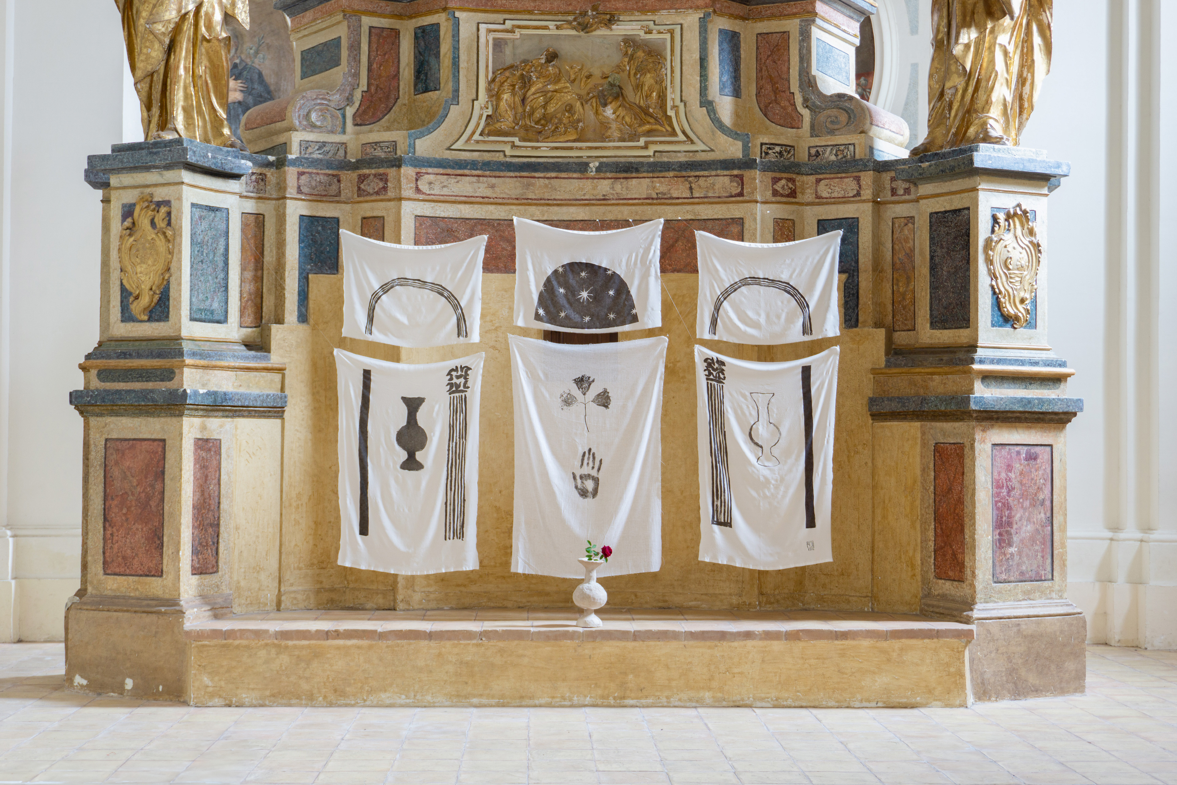 Annunciation | Linocut, silk, cotton, ceramic, encaustic painting on wood | 2021
