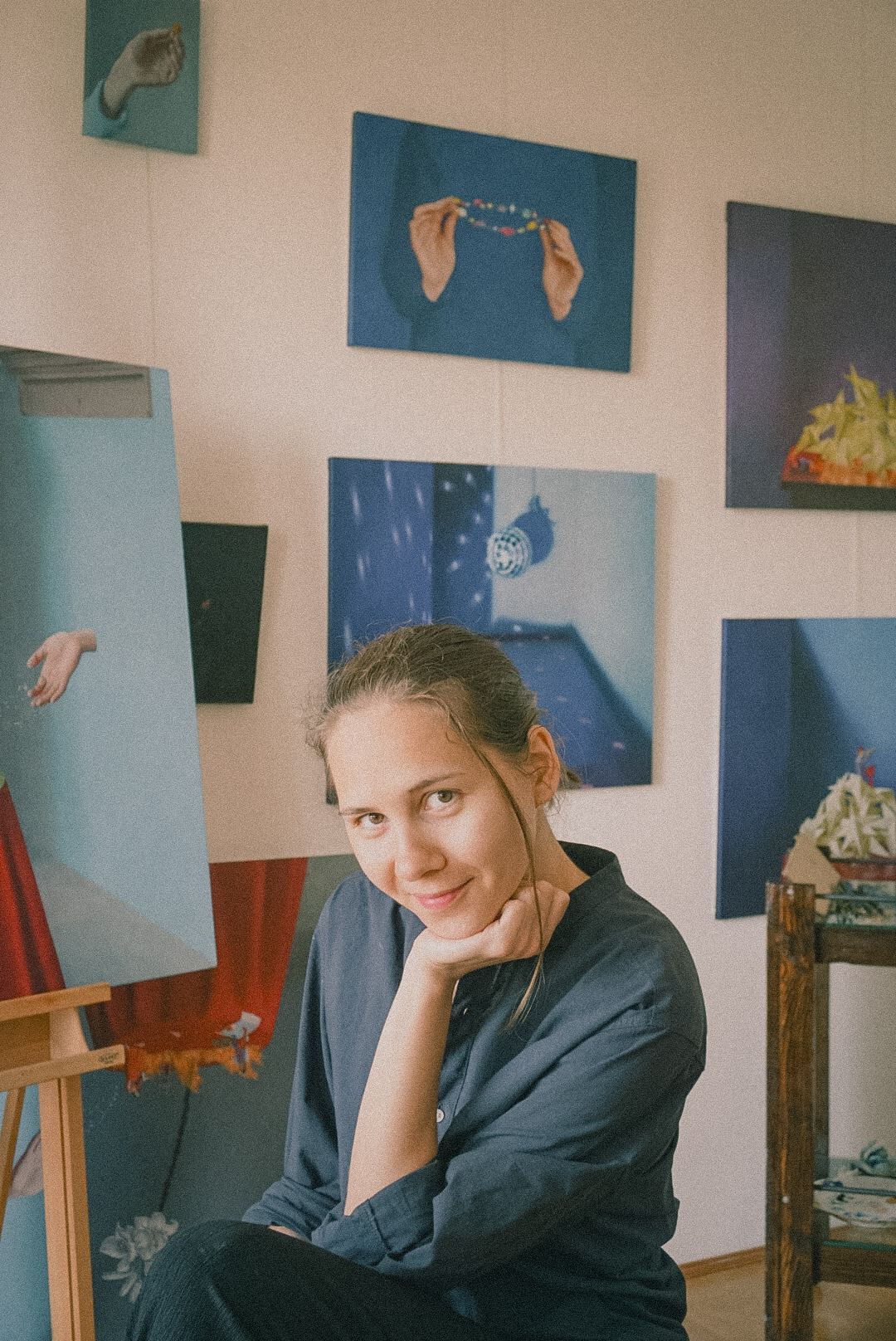 Recurring motifs — fabrics, stars, hands, small objects — act as a visual vocabulary through which familiar elements shift into “everyday myths.” Her works investigate how environments, whether real or imagined, form emotional and symbolic experience. Light becomes a mediator between the visible and the hidden, while gestures operate as subtle carriers of narrative.